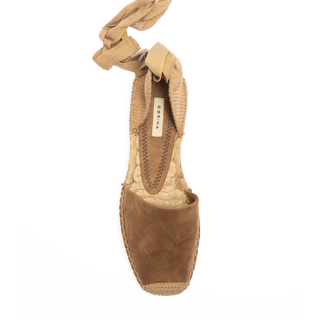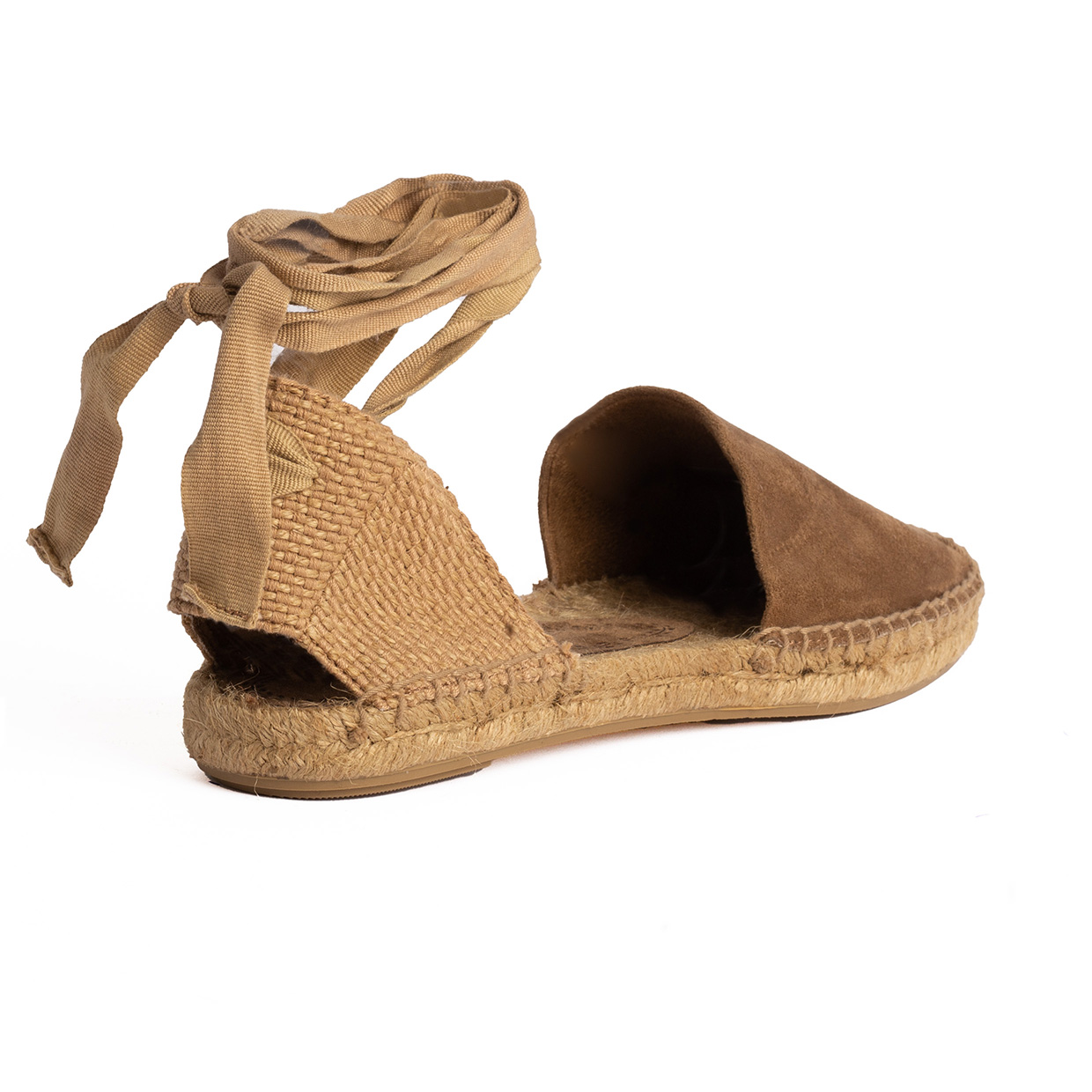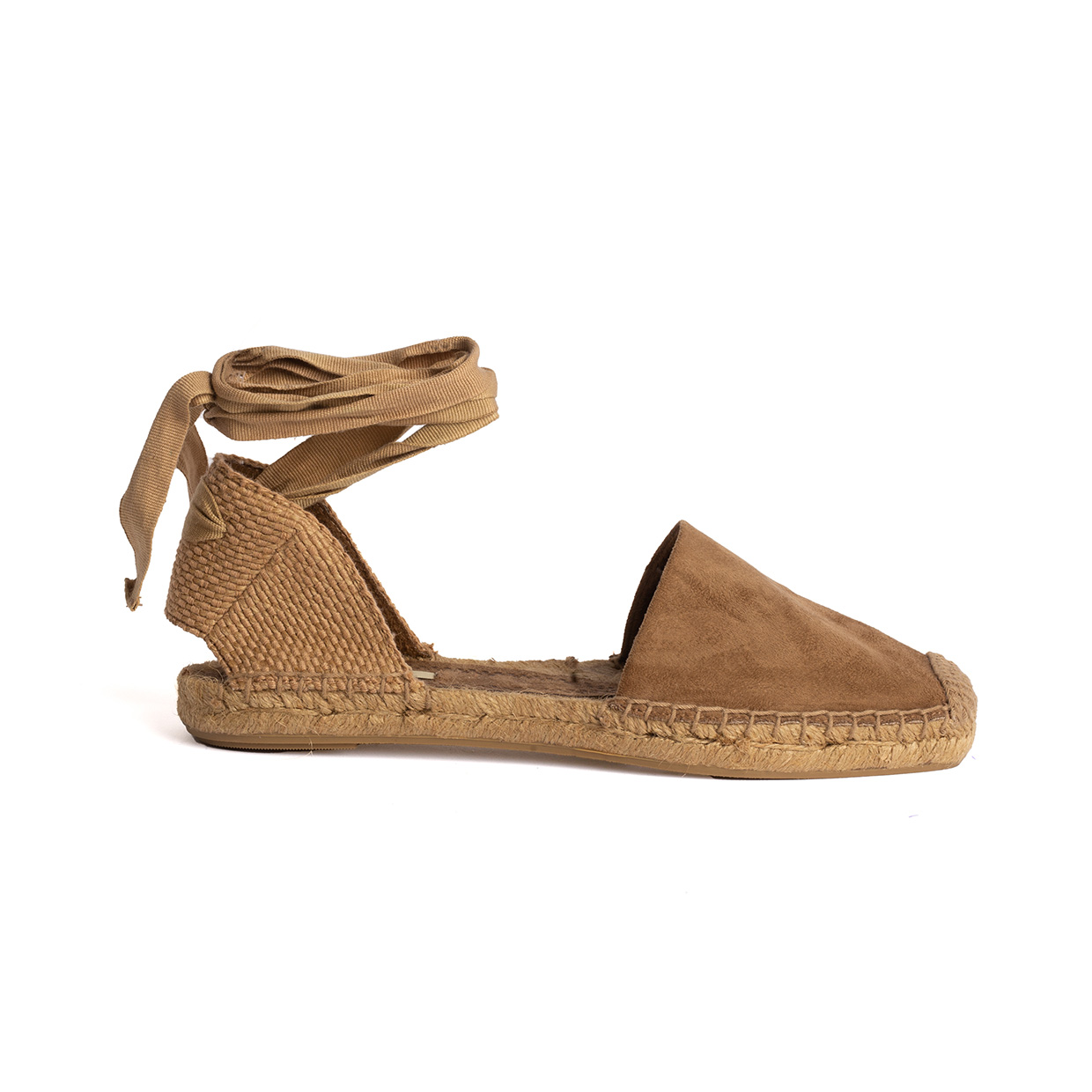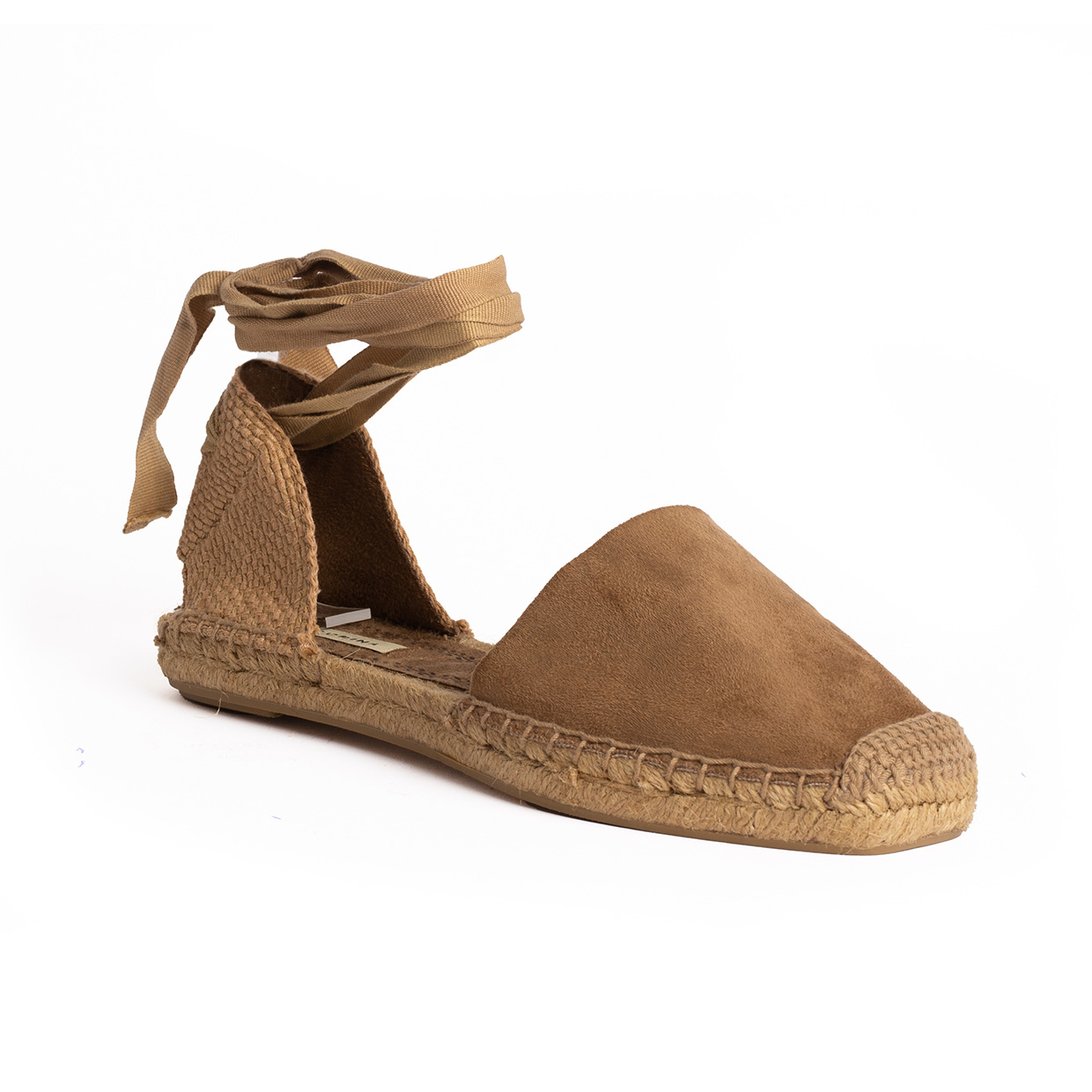 Alpargata plana de tela y lazos para atar en el tobillo . Disponible en kaki y camel .
