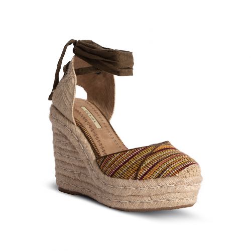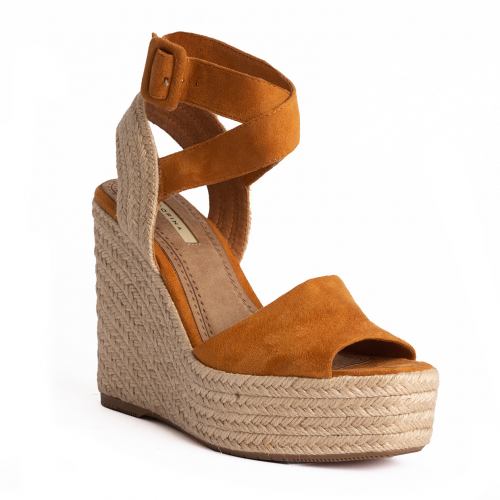 Cuña simple cerrada disponible en varios colores. Cuña de esparto con una tira y hebilla para amarrarla al tobillo, tela en la parte delantera y 8.5 cm de alto.