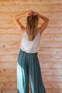 Pantalón de seda estampado en diferentes tonos, su forro interior es suave y confortable y el exterior es elegante y sofisticado. La cintura es de algodón y elastán, se ajusta facilmente y es muy confortable.